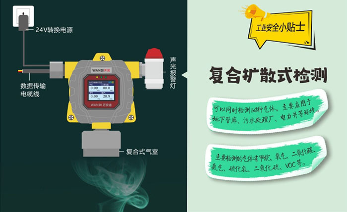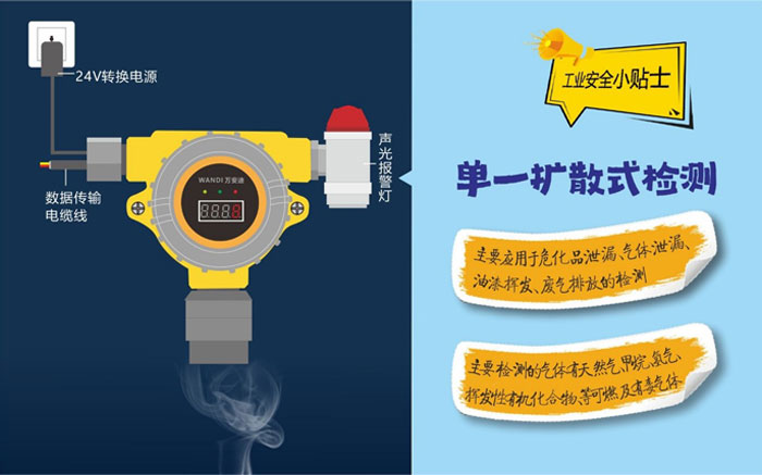 擴(kuò)散在線式氣體探測(cè)器能夠?qū)崟r(shí)的檢查空氣中是否含有一種或多種可燃及有毒有害氣體,一般使用于開(kāi)放場(chǎng)合,如敞開(kāi)的作業(yè)車間,檢測(cè)空氣中泄露的氣體。這種方法受檢測(cè)環(huán)境的影響,如環(huán)境溫濕度、風(fēng)速風(fēng)向等,監(jiān)測(cè)數(shù)據(jù)會(huì)存在一定的誤差。